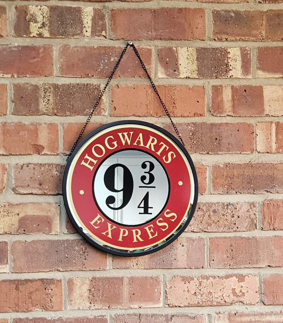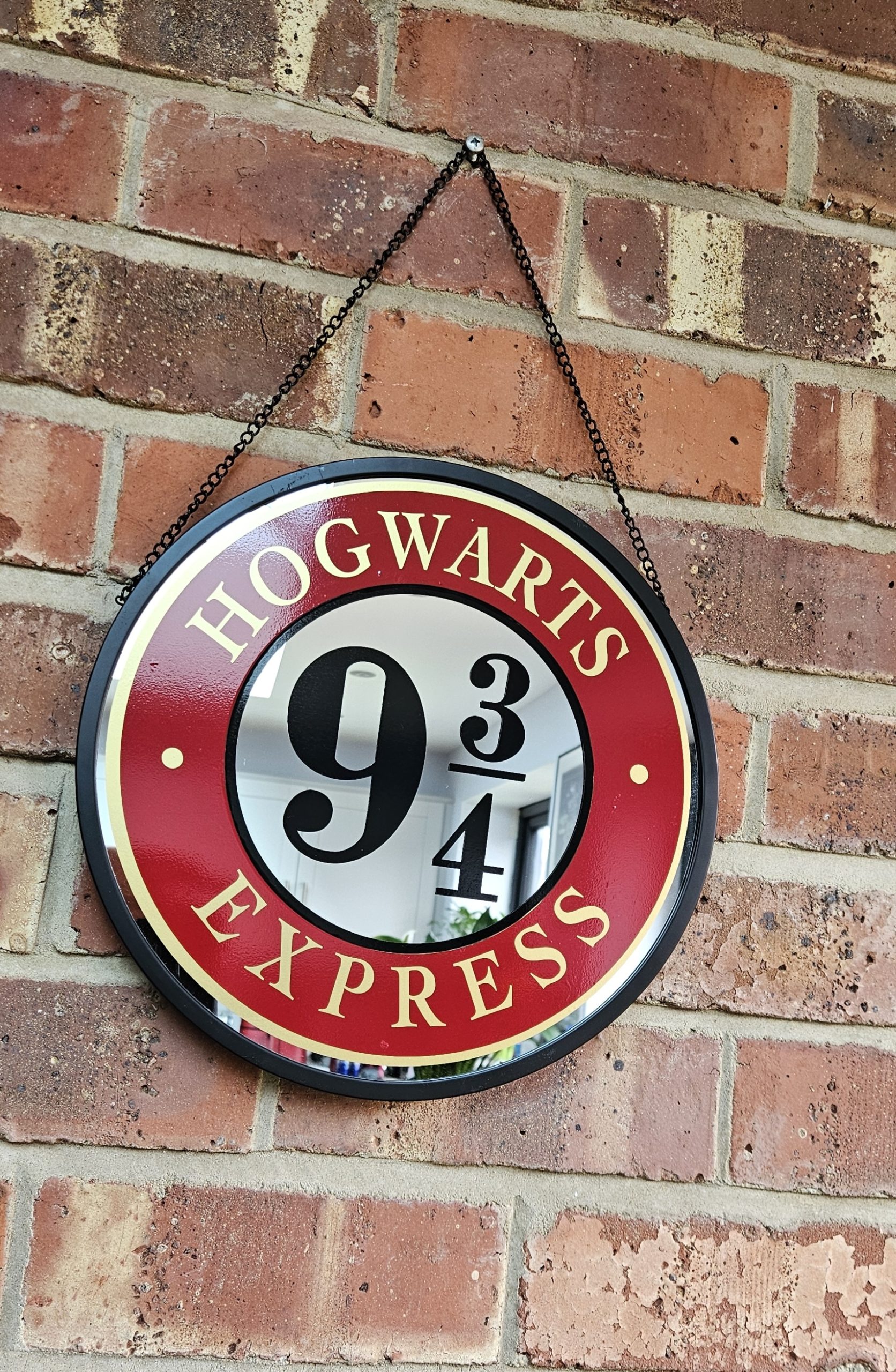 Bring a touch of magic into your home with this Harry Potter mirror, featuring the iconic Hogwarts Express 9 3/4 design. Measuring approximately 31cm in diameter, this round black mirror comes complete with a hanging chain, ready to display on walls in bedrooms, offices, or themed spaces.